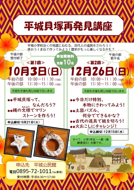 ピラティス ヨガ教室 お灸体験 スマホ講座 ハーモニカ教室 英会話教室 ハーバリウム教室 アーチェリー体験 ボール体操 平城貝塚再発見講座 こども生花教室 こども茶道教室 平城健康ウォーク デジタルミュージック講座 チョコレートのお菓子づくり教室 (注)興味のある講座名をタッチすると、そのページへ移動します。