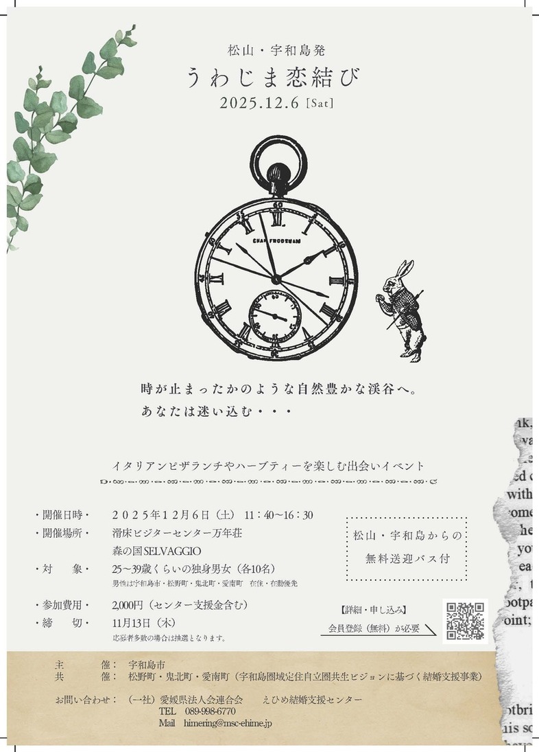 宇和島圏域の市町(宇和島市・松野町・鬼北町・愛南町)で締結する、宇和島圏域定住自立圏共生ビジョンに基づく事業として、出会いの場を提供するイベントを開催します。素敵な出会いを探してみませんか?