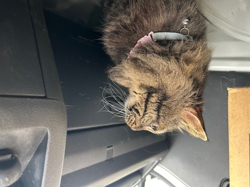 ダークブラウン・キジトラ・長毛・中型・ピンクと水色の首輪(鈴付き)