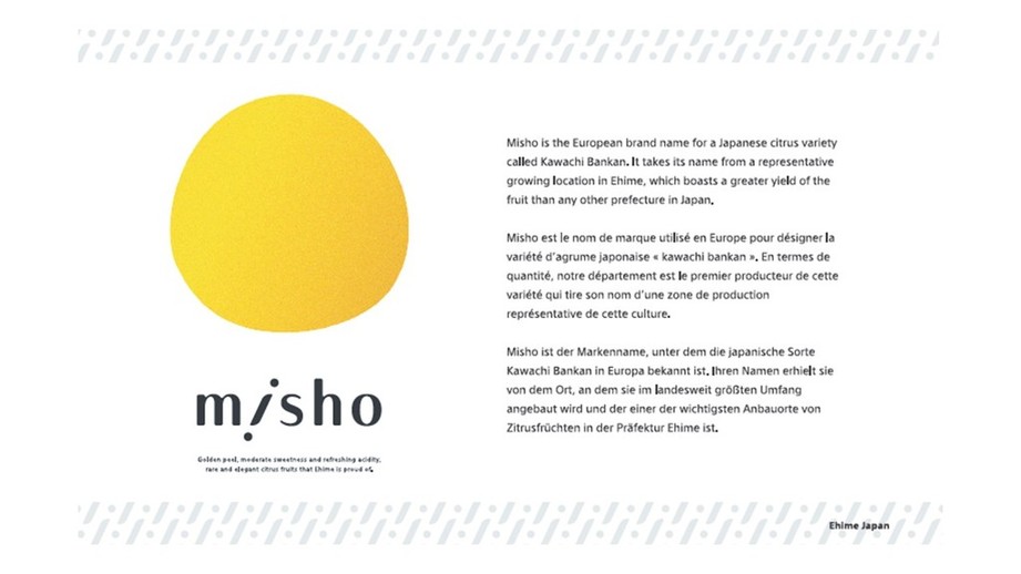 欧州で愛南ゴールドを展開していくにあたって、欧州販売向け専用の名称として「Misho」と命名・商標登録し、欧州初進出に挑みます。(注)「Misho」については、当ページ下【「Misho」について】をご覧ください。